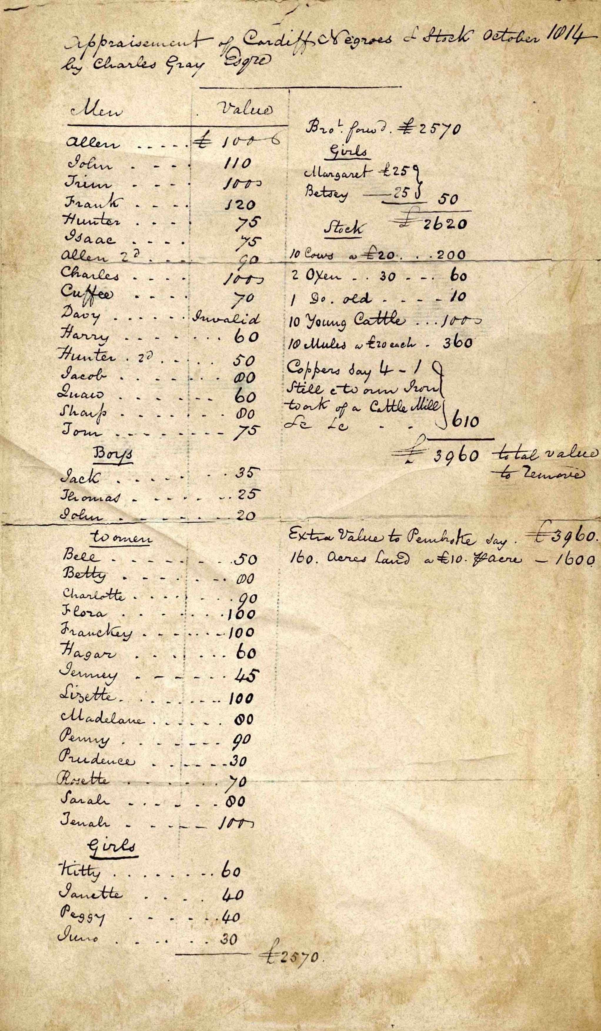 “Appraisement of Cardiff Negroes & Stock October 1814 by Charles Gray Esq.”