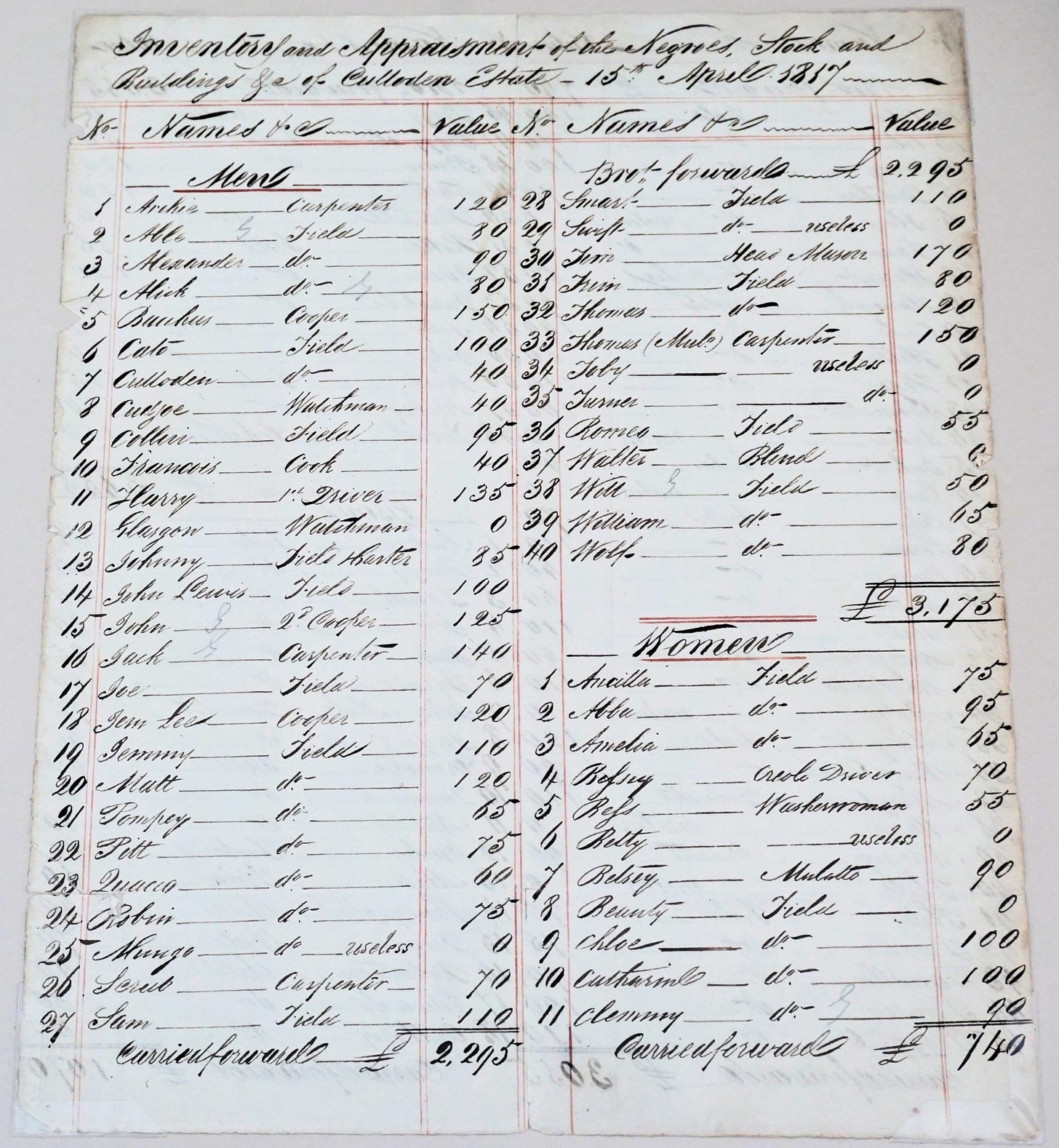 Culloden Estate Inventory, Tobago (1817) - a handwritten record valuing human lives as property.
